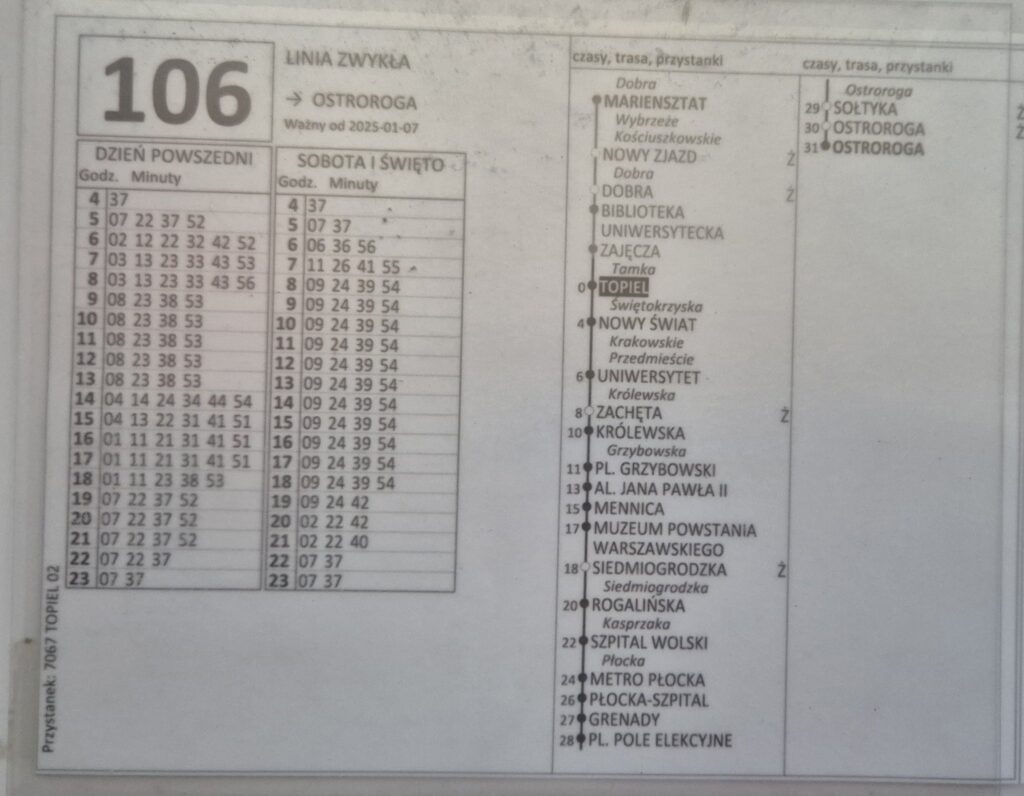 Warszawa, 18 lutego 2025 r., godzina szczytu. Na przystanku Topiel 02, u zbiegu ulic Topiel i Tamki, pasażerowie czekają na jedyny autobus kursujący tą trasą – linię 106. Mróz sięga -5°C, a rozkład jazdy wskazuje, że autobus powinien nadjechać o 16:41. Nie pojawia się jednak ani wtedy, ani o 16:51, gdy powinien przyjechać kolejny. Ostatecznie autobus dociera dopiero o 17:01, z ponad 20-minutowym opóźnieniem.