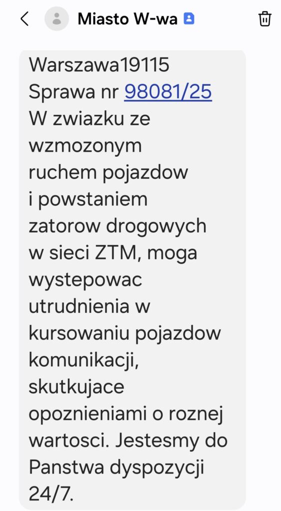 „W związku ze wzmożonym ruchem pojazdów i powstawaniem zatorów drogowych mogą występować opóźnienia w komunikacji miejskiej.”