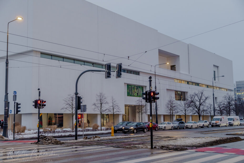 Tymczasem miasto postawiło Muzeum Sztuki Nowoczesnej w Warszawie — budynek, który jest nie tylko ciężki i nieprzyjazny w odbiorze, ale przede wszystkim odwrócony plecami do Marszałkowskiej. Od strony ulicy nie ma fasady w sensie miejskim, tylko ciąg niskich, ciemnych podcieni, które zamiast tworzyć reprezentacyjną przestrzeń publiczną, funkcjonują jak zaplecze.