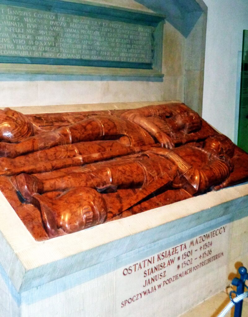 Ostatnimi męskimi przedstawicielami mazowieckiej linii Piastów byli książęta Stanisław i Janusz. Starszy z nich, 24-letni Stanisław, zmarł 8 sierpnia 1524 r. Młodszy, 25-letni Janusz III, zmarł w nocy z 9 na 10 marca 1526 r. Bracia nie byli żonaci i nie pozostawili potomstwa. Obaj zostali pochowani we wspólnym grobowcu w warszawskiej kolegiacie św. Jana Chrzciciela (obecnie bazylice mniejszej). Płytę nagrobną ufundowała księżna Anna Konradówna w latach 1526–1528. Jest to wybitne dzieło i najprawdopodobniej najwspanialsza ze wszystkich rzeźb fundacji książąt mazowieckich. Płyta wykonana jest z czerwonego marmuru i obecnie — niestety — pozbawiona architektonicznego obramowania. Jej autorem był najprawdopodobniej Bernardino de Gianotis. Swobodne ułożenie postaci zwróconych ku sobie i splecionych w braterskim uścisku świadczy o nowatorstwie tego renesansowego dzieła. Portretowa indywidualizacja twarzy, doskonale oddane maksymiliańskie zbroje oraz precyzja opracowania detalu składają się na wysoką klasę artystyczną nagrobka, symbolicznie zamykającego dzieje mazowieckich Piastów.